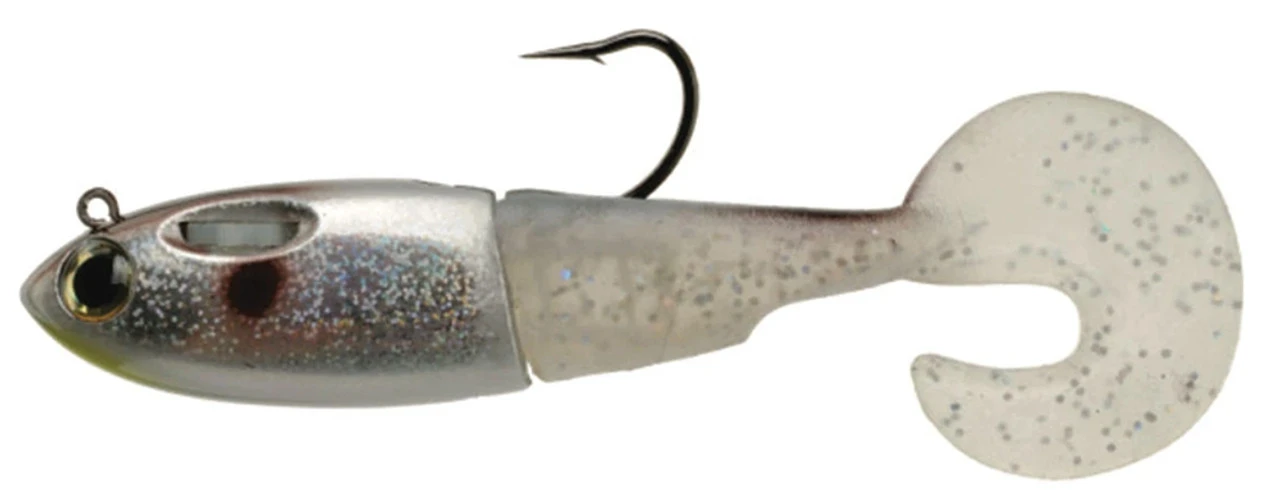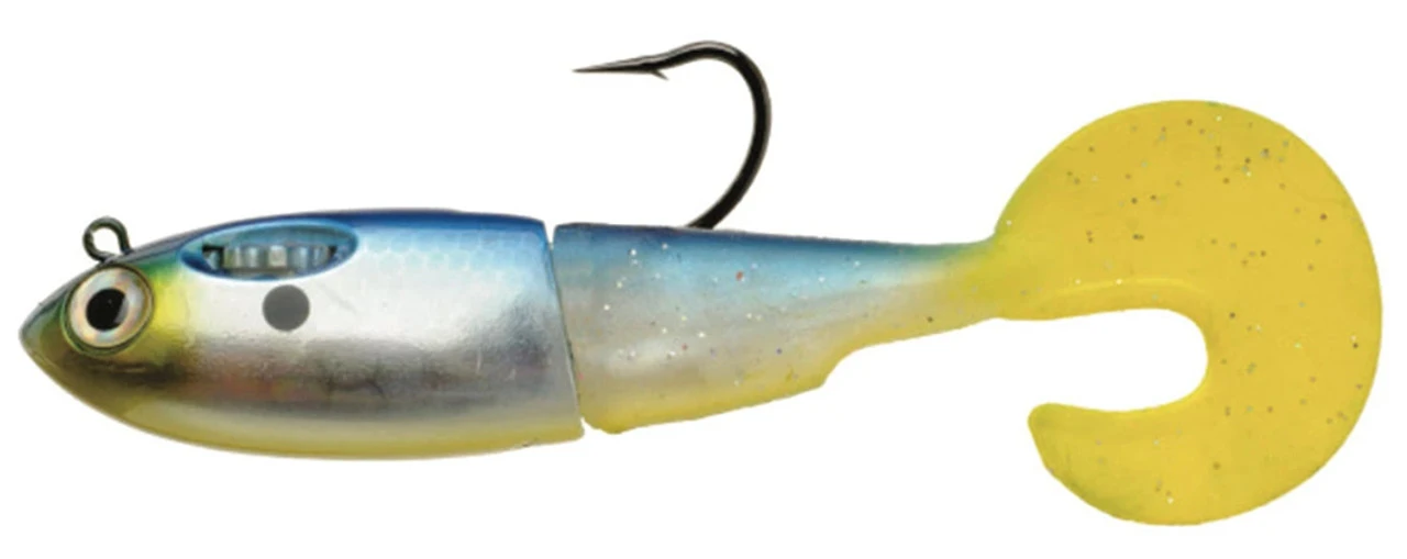 The SpoolTek Fatty Curly has a short, thick, baitfish profile designed to emulate pilchards, croakers, pinfish, finger mullet, herring, threadfin shad, gizzard shad, bunker and others. It features a curly swim tail for increased and versatile action. The lure’s most unique feature is the internal spool containing a stainless steel leader (braid for Bass colors only) that will separate from the lure when a fish strikes. This allows anglers to use lighter leaders attached to the eyelet of the lure, thus enhancing the action while preventing breakoffs due to the internal leader. It is also important to note that the hooked up fish will be unable to use the weight of the lure for leverage to throw the hook.